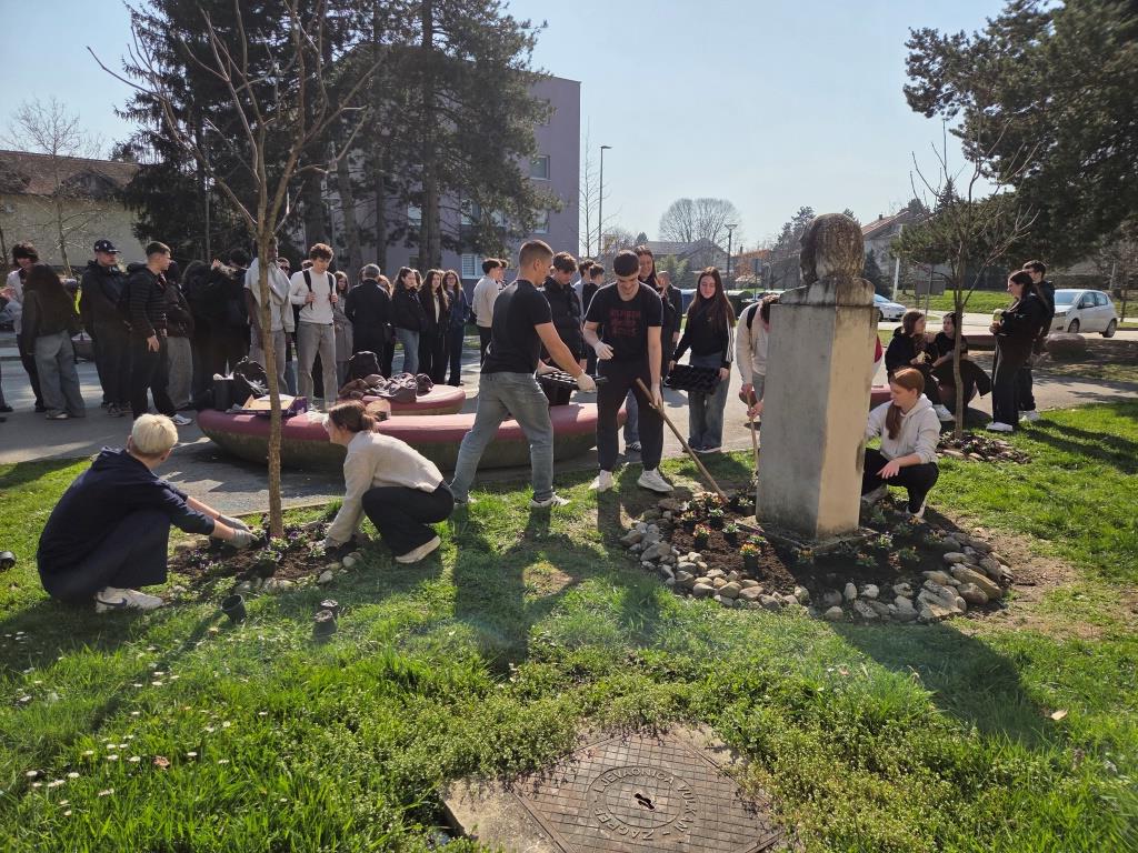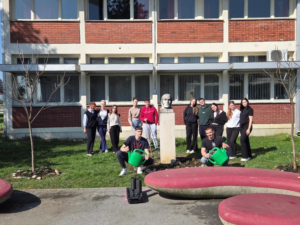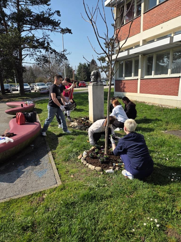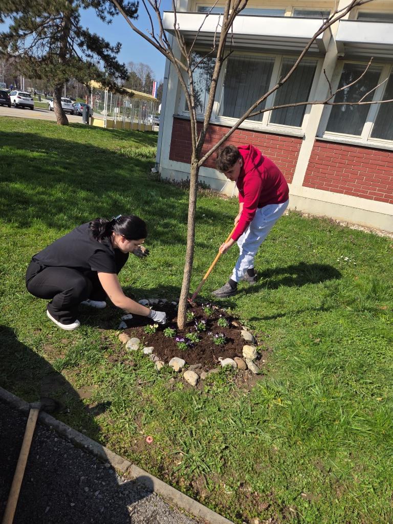 Članovi grupe Mladi ekolozi 4. i 5. ožujka prionuli su uređenju tri mala cvjetnjaka maćuhicama. Trebalo je izvaditi uvenule i zimom uništene jesenske maćuhice, okopati zemlju, posipati svježu, isplanirati raspored, posaditi i zaliti nove svježe proljetnice. Kao i do sada, entuzijasti i ljubitelji cvijeća i druženja, učenici trećeg razreda ekonomskog te trećeg i četvrtog razreda komercijalnog usmjerenja s radošću i zanosom uljepšali su prostor ispred škole. Svakodnevna briga je veselje, a ponos profesorice Gordane neizmjeran.