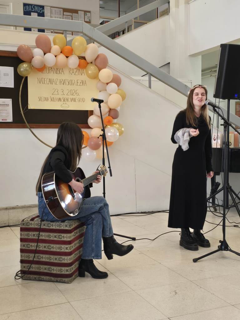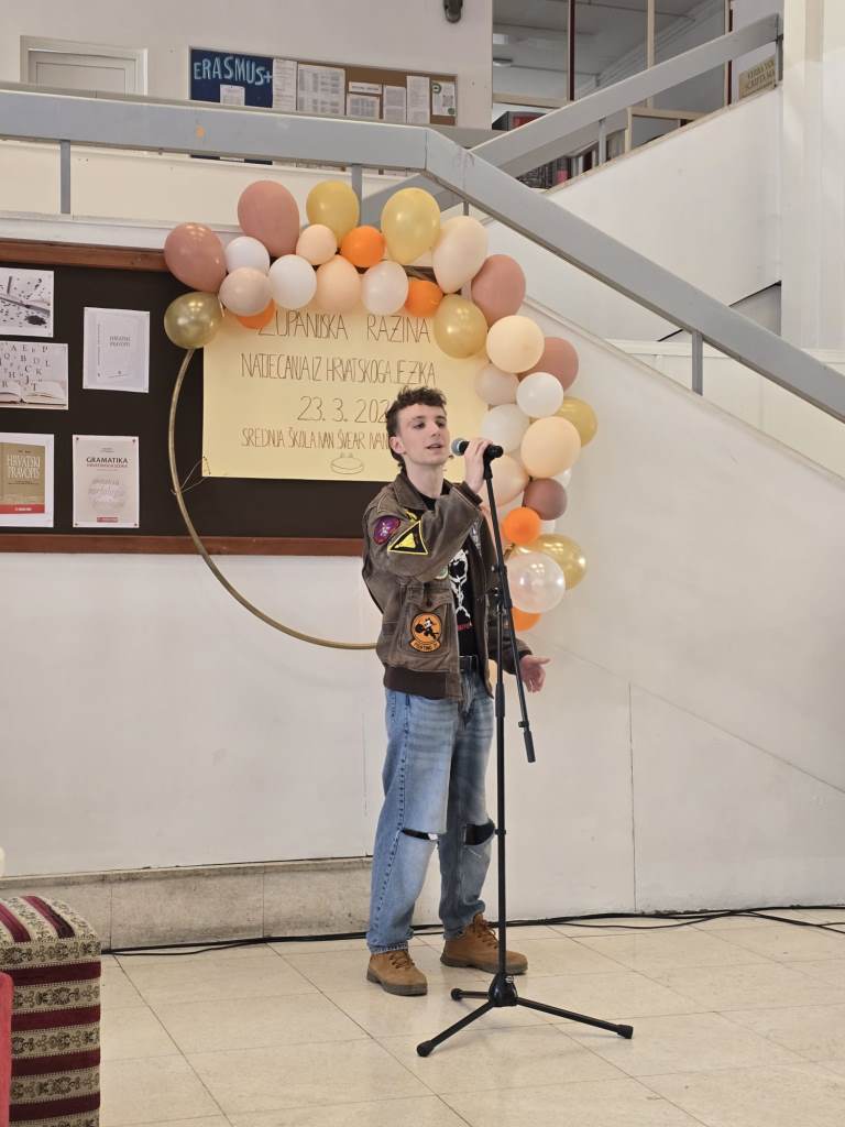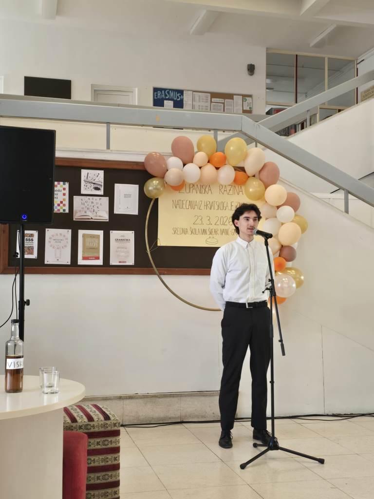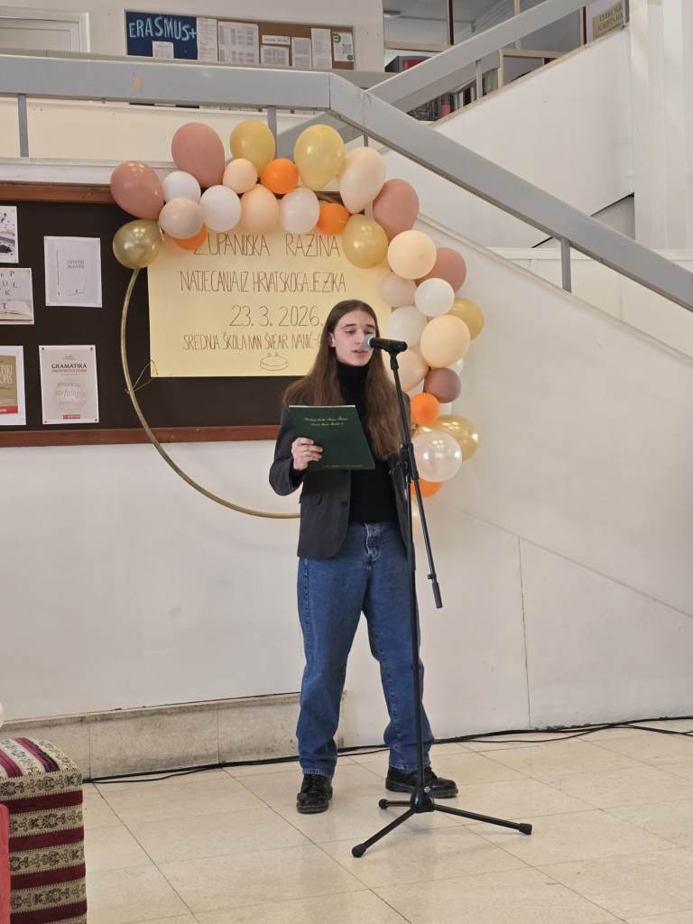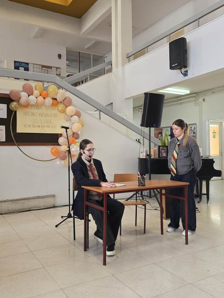 Županijsko Natjecanje iz hrvatskog jezika otvoreno je uvodnim govorom ravnateljice Josipe Ilić te  kratkim scenskim programom u kojem su sudjelovali učenici Karlo Andreani (3.A), Vid Vulinec (4.B), Lukas Lovrenović (2.B), Tena Domović (2.B), Lucija Kirin (2.B), Helena Hudorović (4.B) i  Leona Hudorović (3.B). Program je s učenicima pripremila Valentina Pižir.